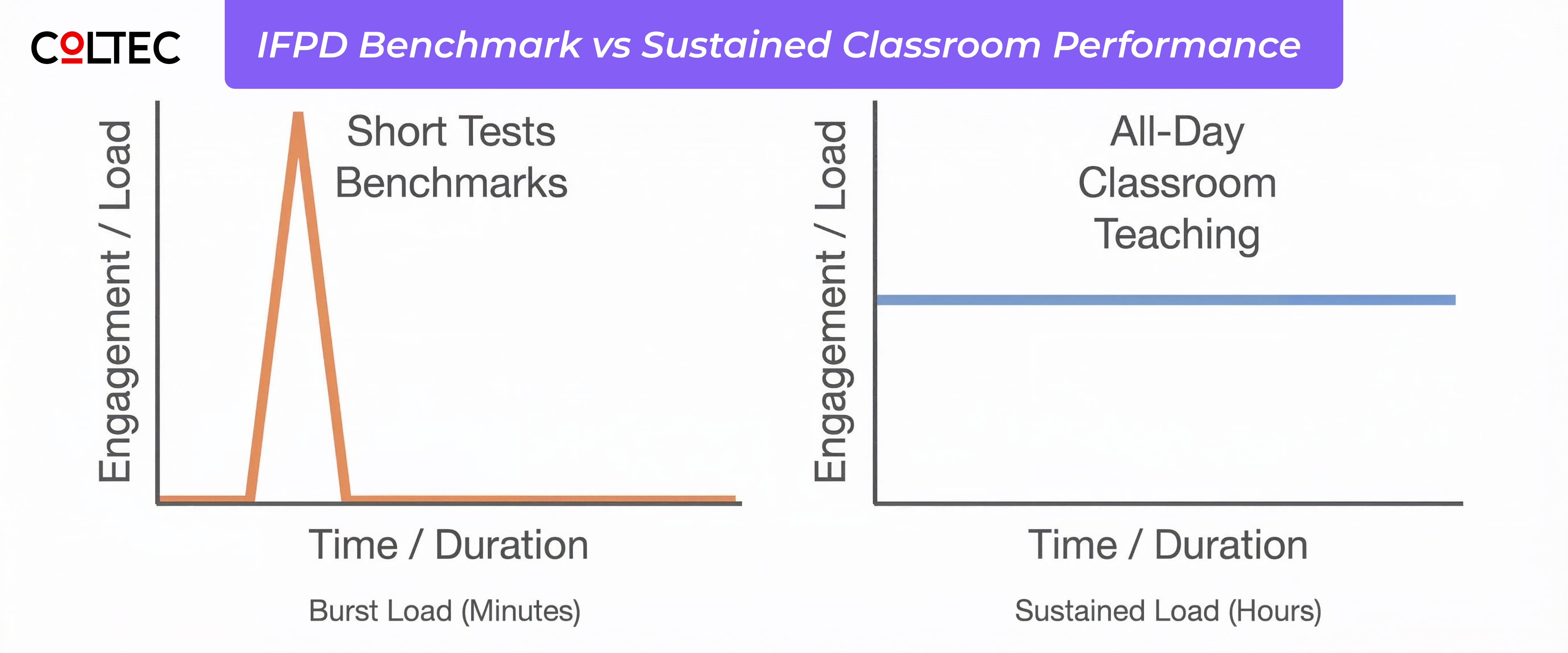 The reason is simple: classrooms do not behave like consumer devices. Teaching environments demand continuous, multi-task stability, not short bursts of speed.